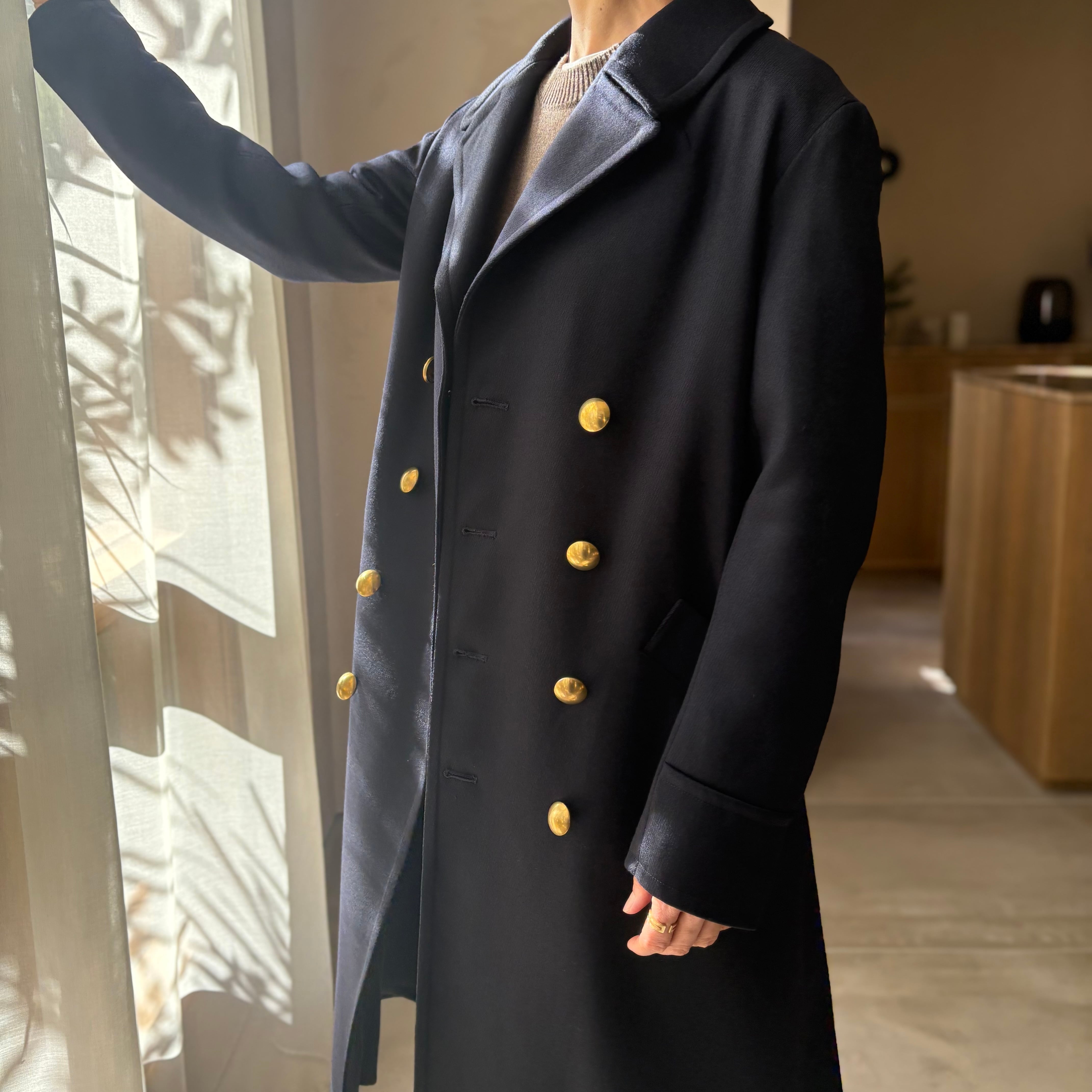 Scyeが手がけるダブルチェスターコートは、ブランドのテーラリング哲学を凝縮した一着です。