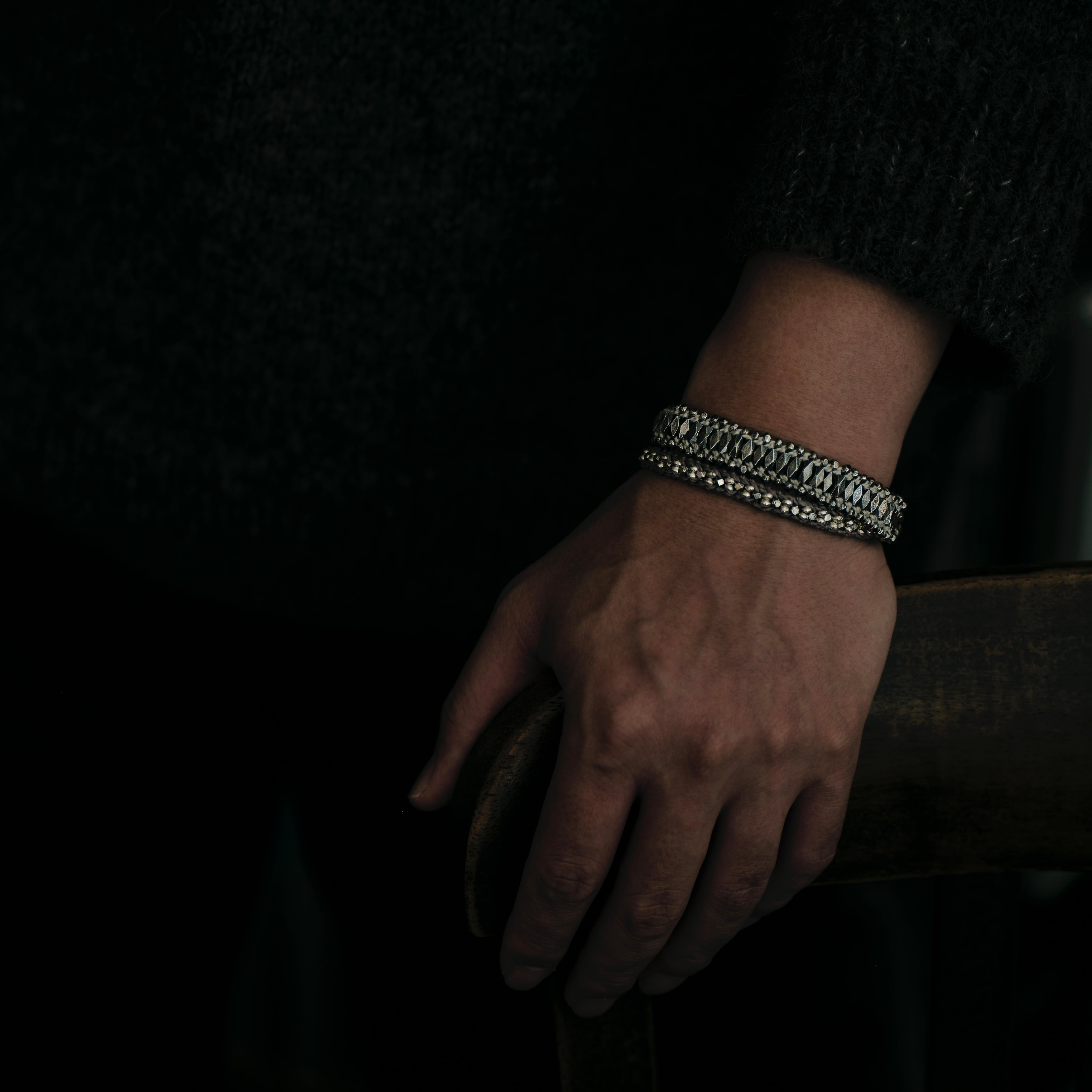 ミャンマーとタイの間の山岳地帯に暮らす民族によって一つ一つ手作業で形作られた様々な形のシルバーのビーズを使用し、それぞれを燻を施したり鍍金を施し一粒一粒を編み込みブレスレットにしました。