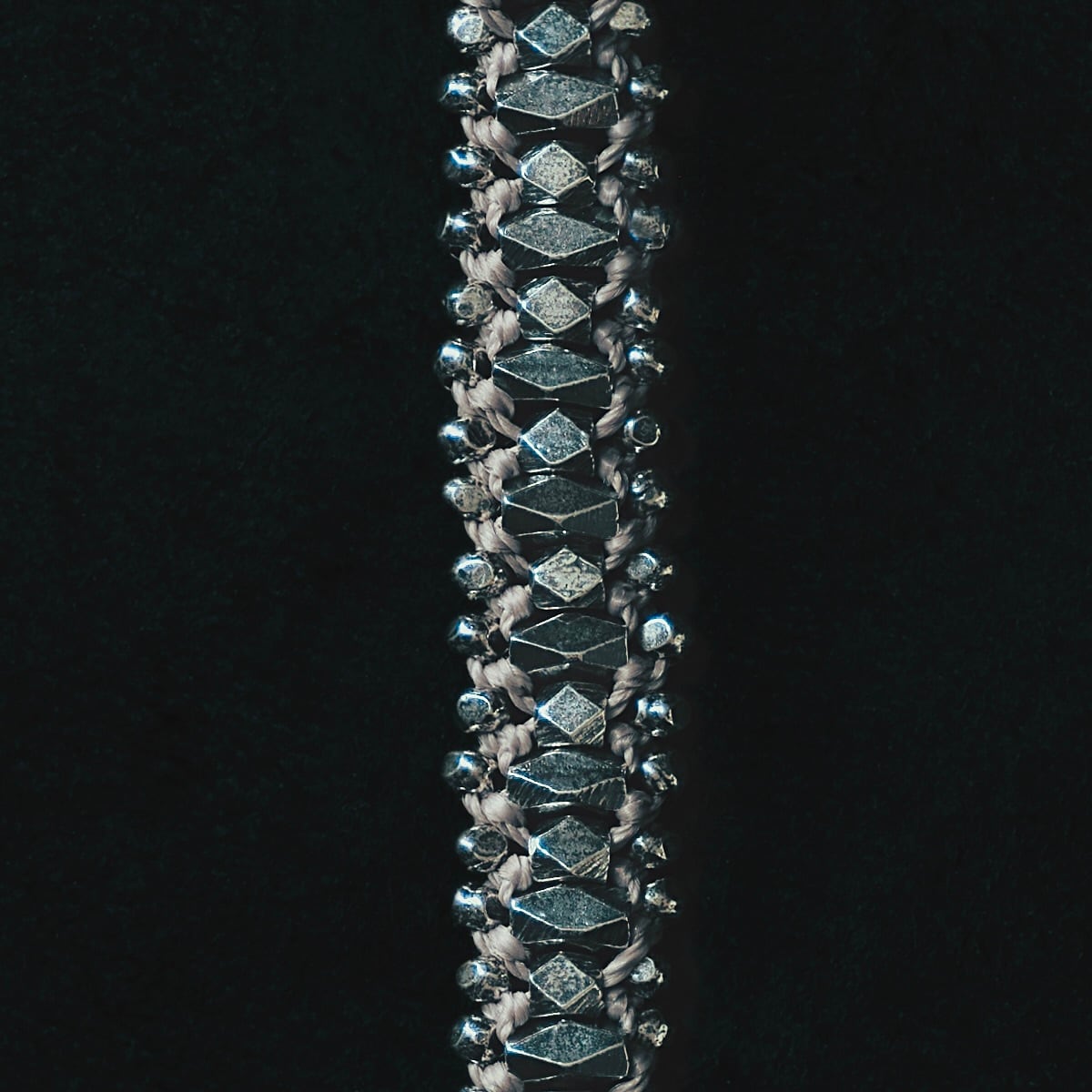 ミャンマーとタイの間の山岳地帯に暮らす民族によって一つ一つ手作業で形作られた様々な形のシルバーのビーズを使用し、それぞれを燻を施したり鍍金を施し一粒一粒を編み込みブレスレットにしました。