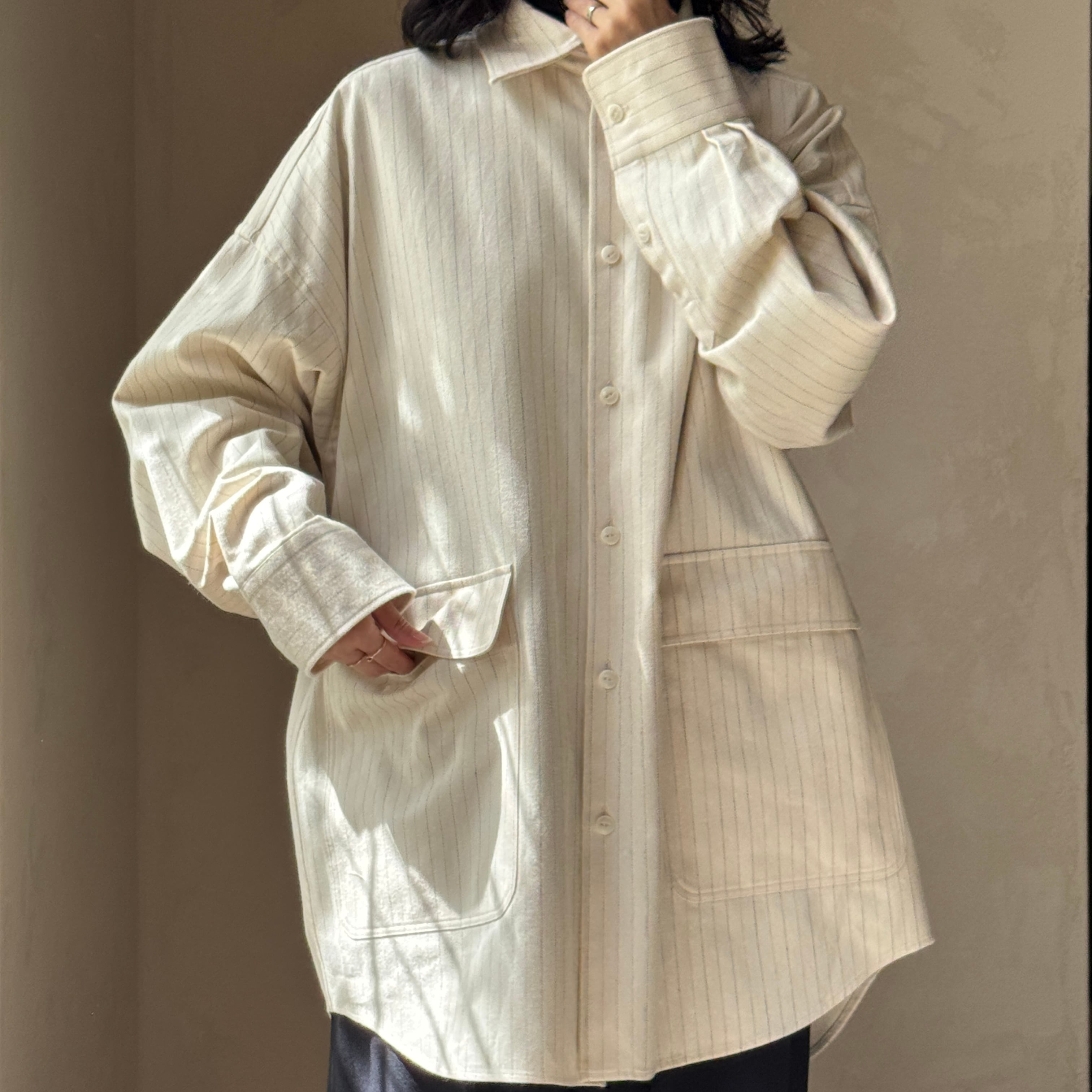 ルーズなドレスシャツに、ジャケットのフラップポケットを付けた、シャツの様なジャケットの様な不思議なデザインが特徴。