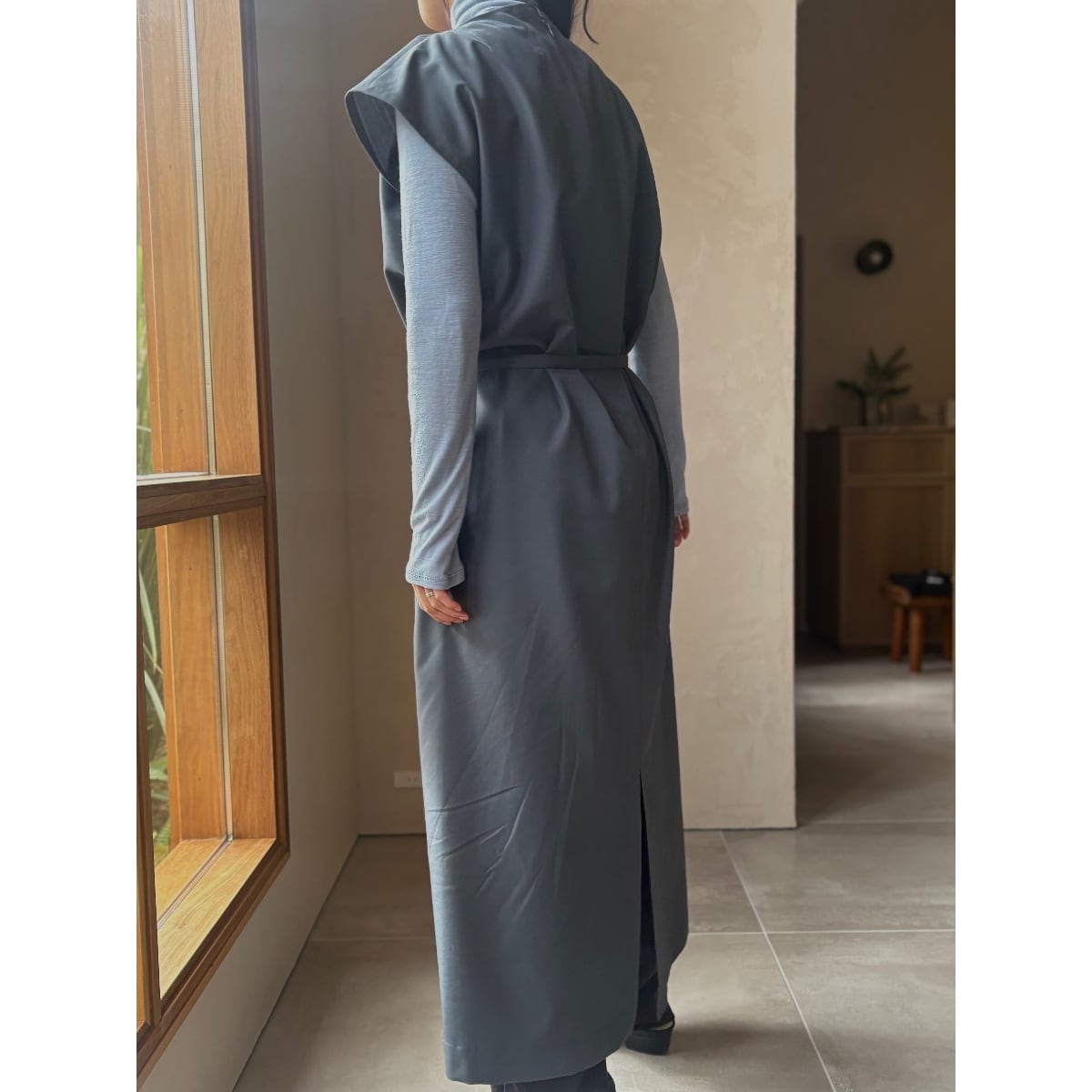 ウエストに付属したウエストベルトを使⽤することで、シルエットの変化も演出します。