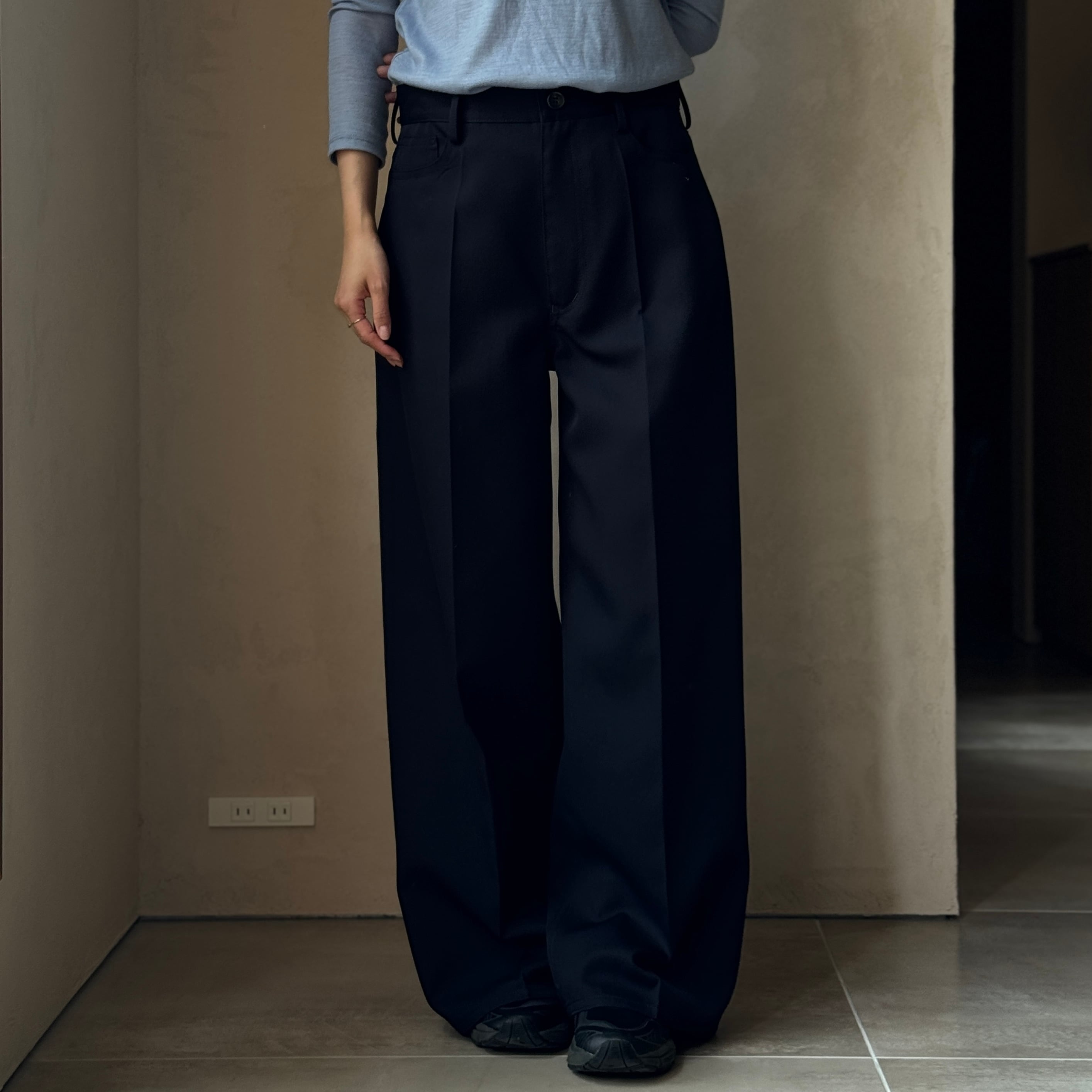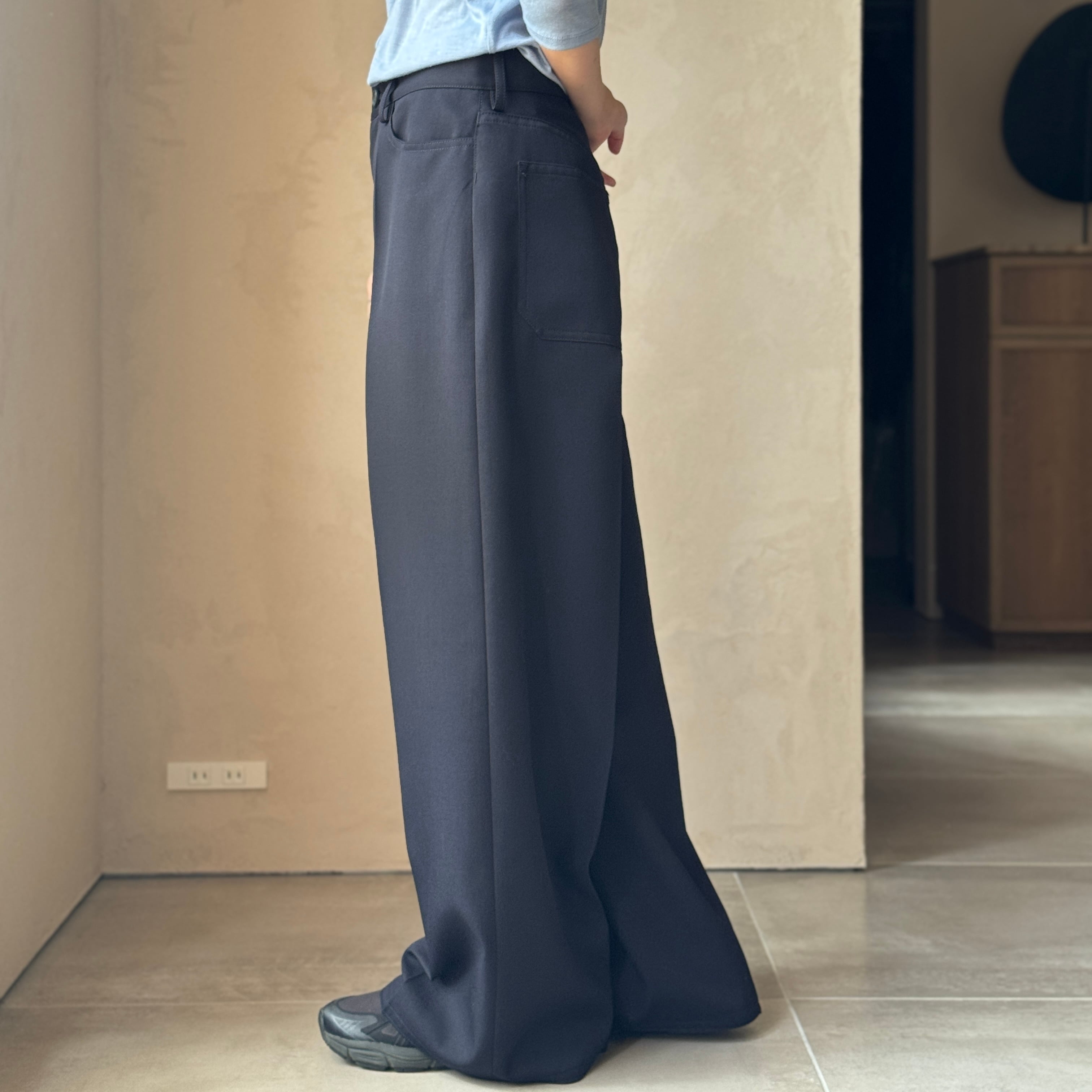 5ポケットパンツ、デニムのシルエットをパリッとしたウールで仕上げてモダンなバランスにしています。