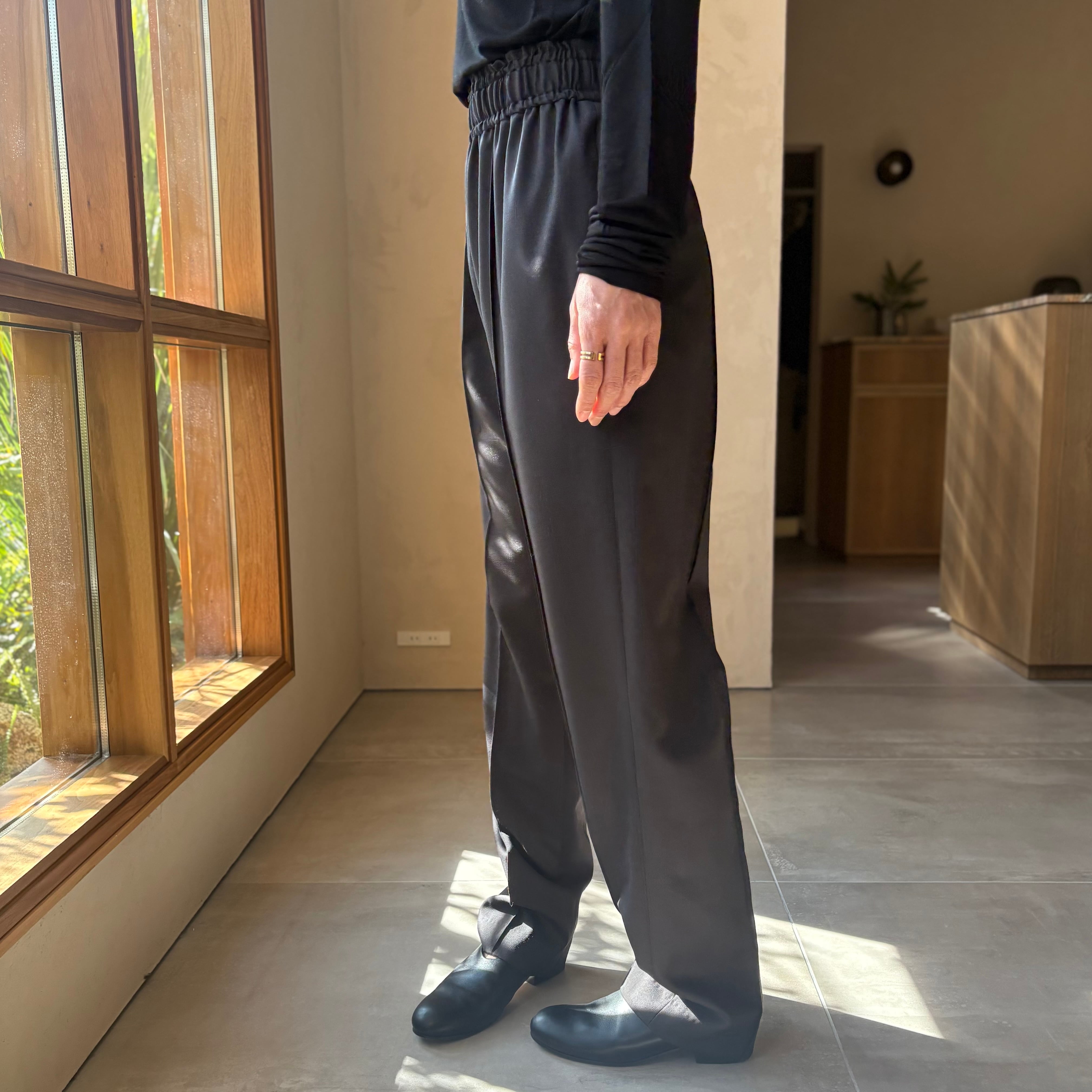 ウエストはリラックス感のあるゴムですが、程よいハリ感がエレガントなムードです。
