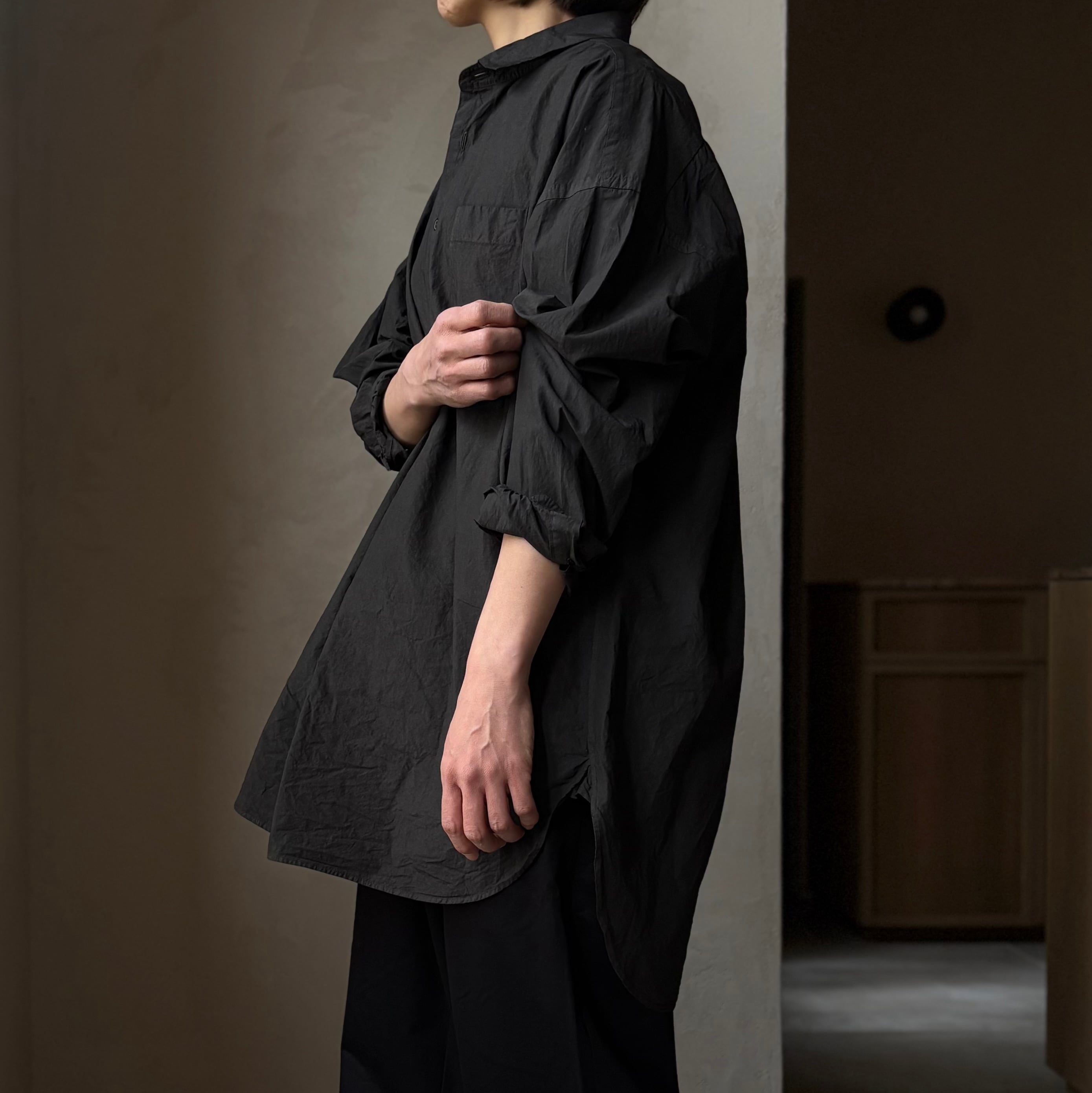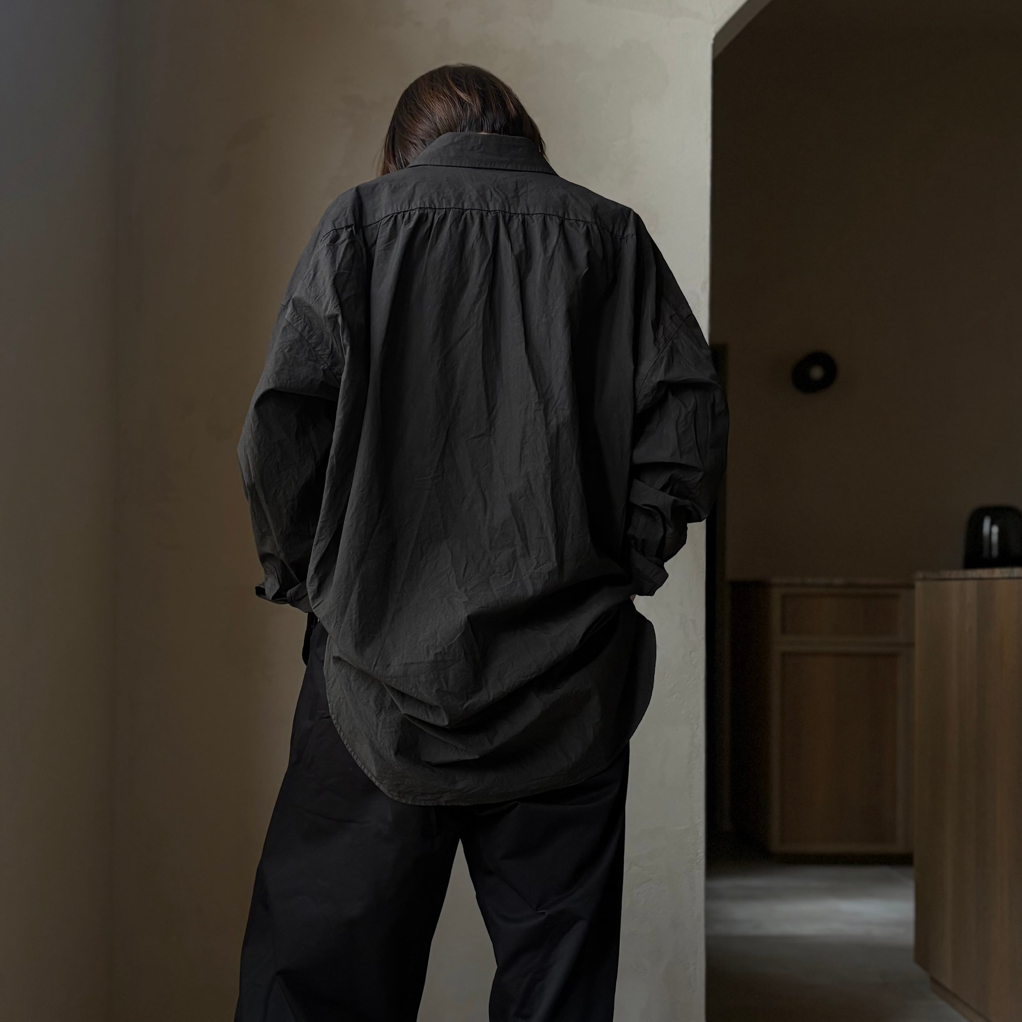 ドレスシャツのようなパターンメイキングでありながら、程よくドロップしたショルダーラインと広めの身幅が生む力の抜けたルーズシルエットが魅力です。