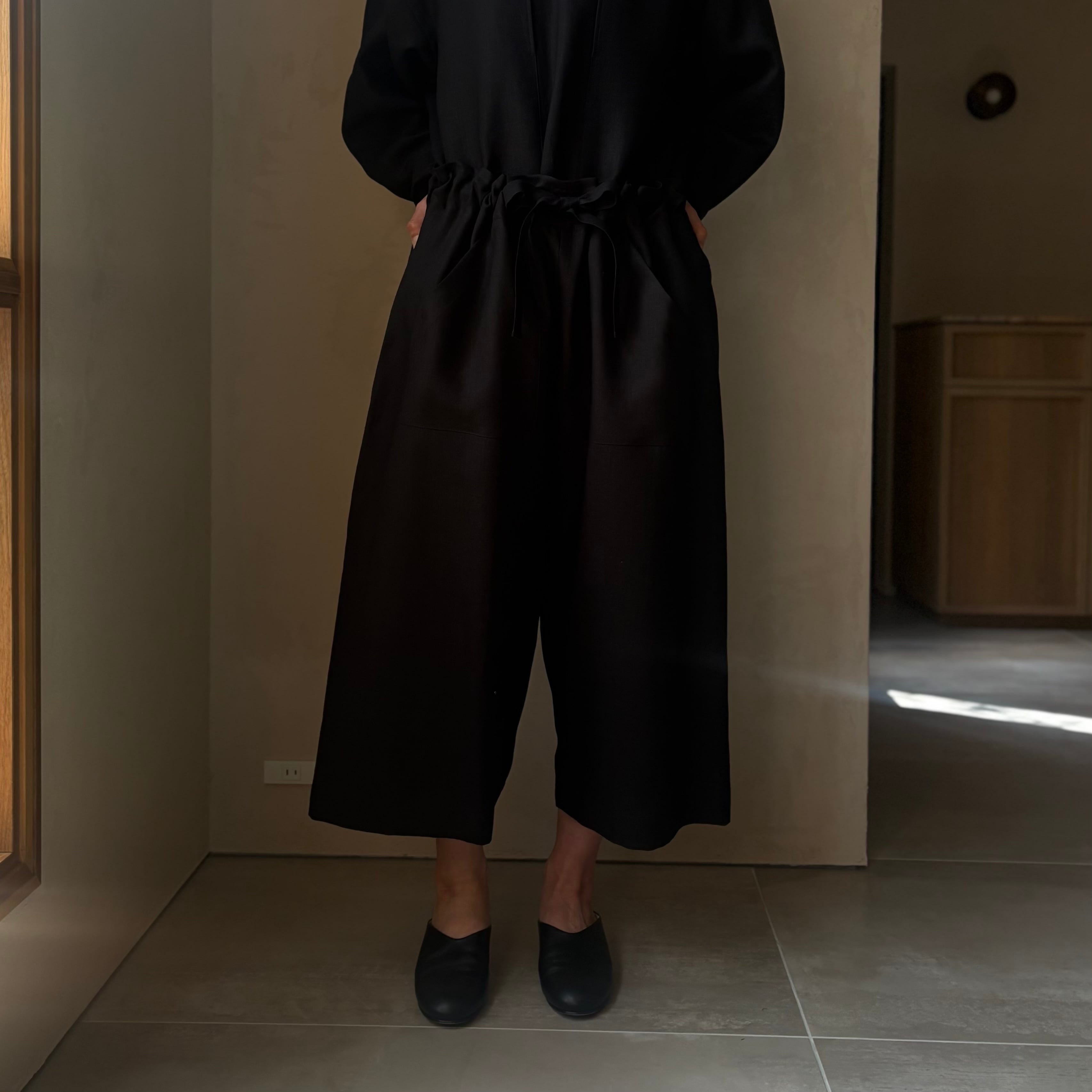 ウエストを紐で調整するのみのルーズパンツ。