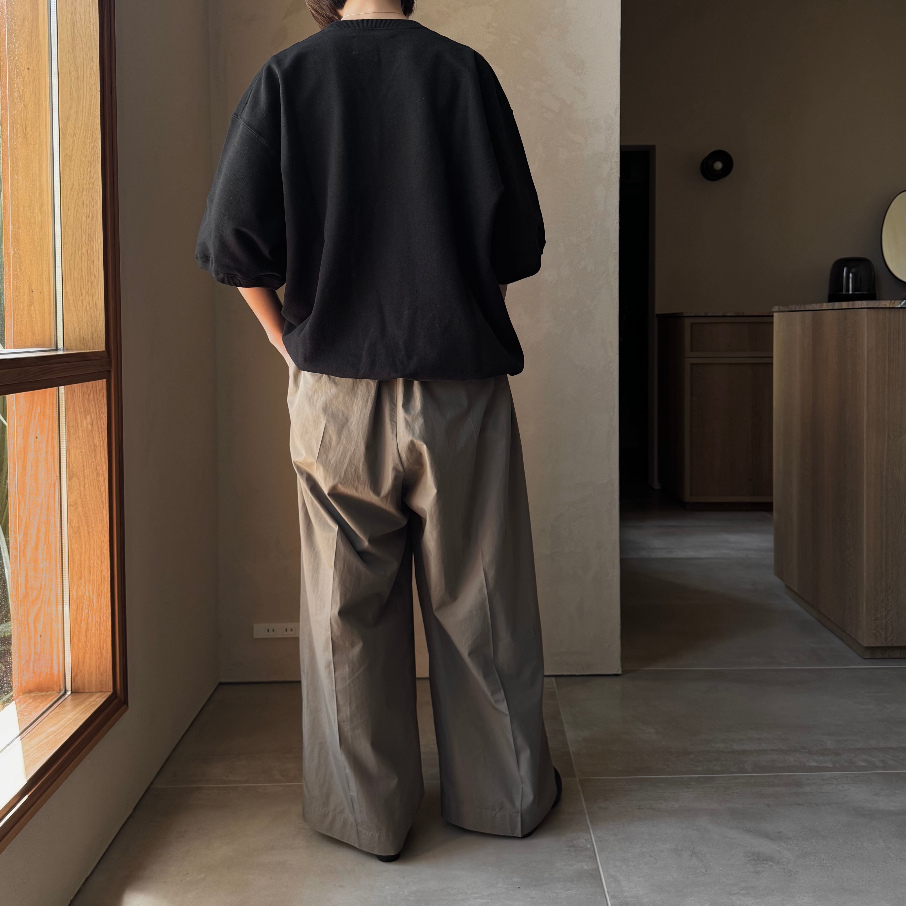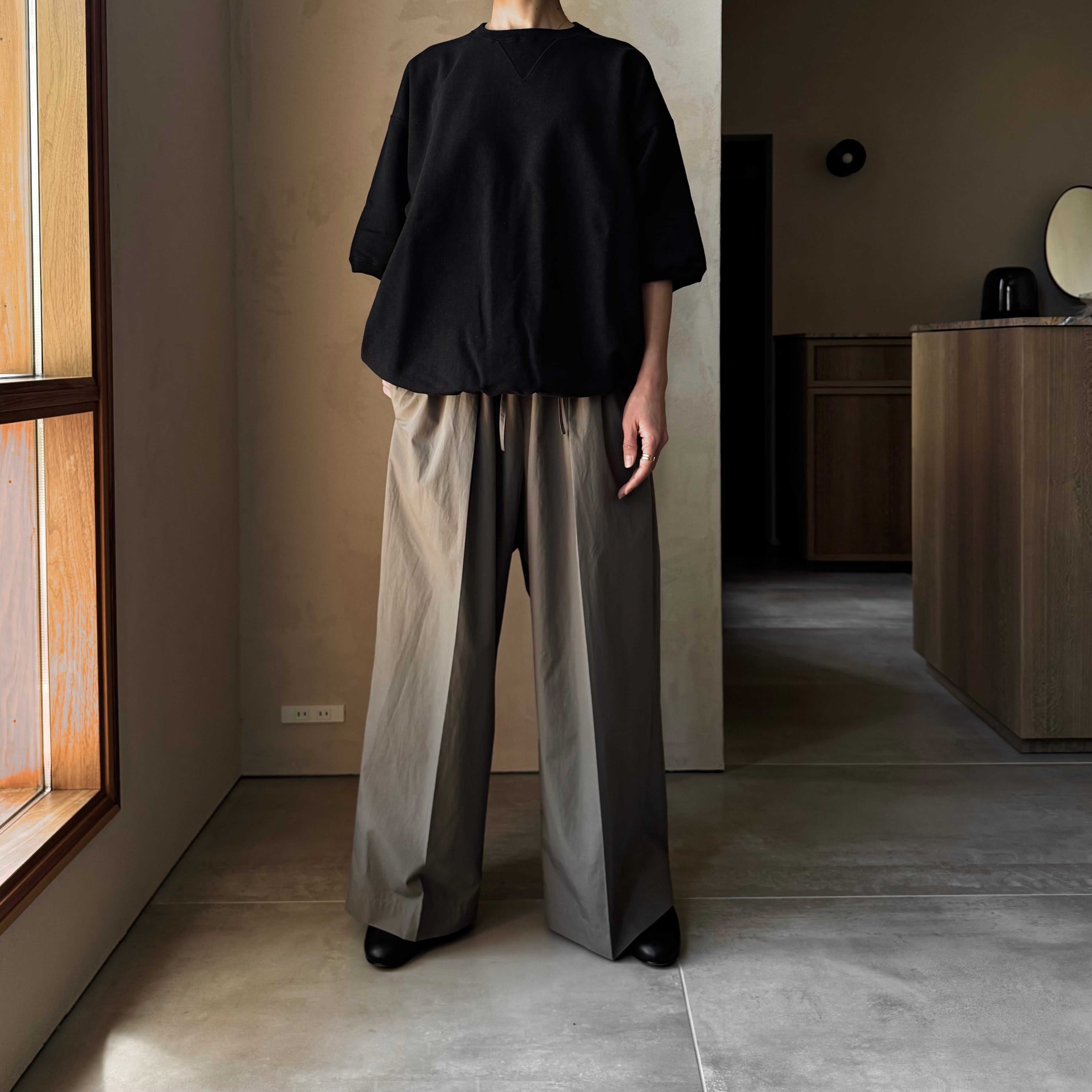 80番糸を高密度に織り上げた綿平織り素材は、ぱさっとドライなタッチと、しなやかな落ち感があります。肌離れが良く涼しく着られます。