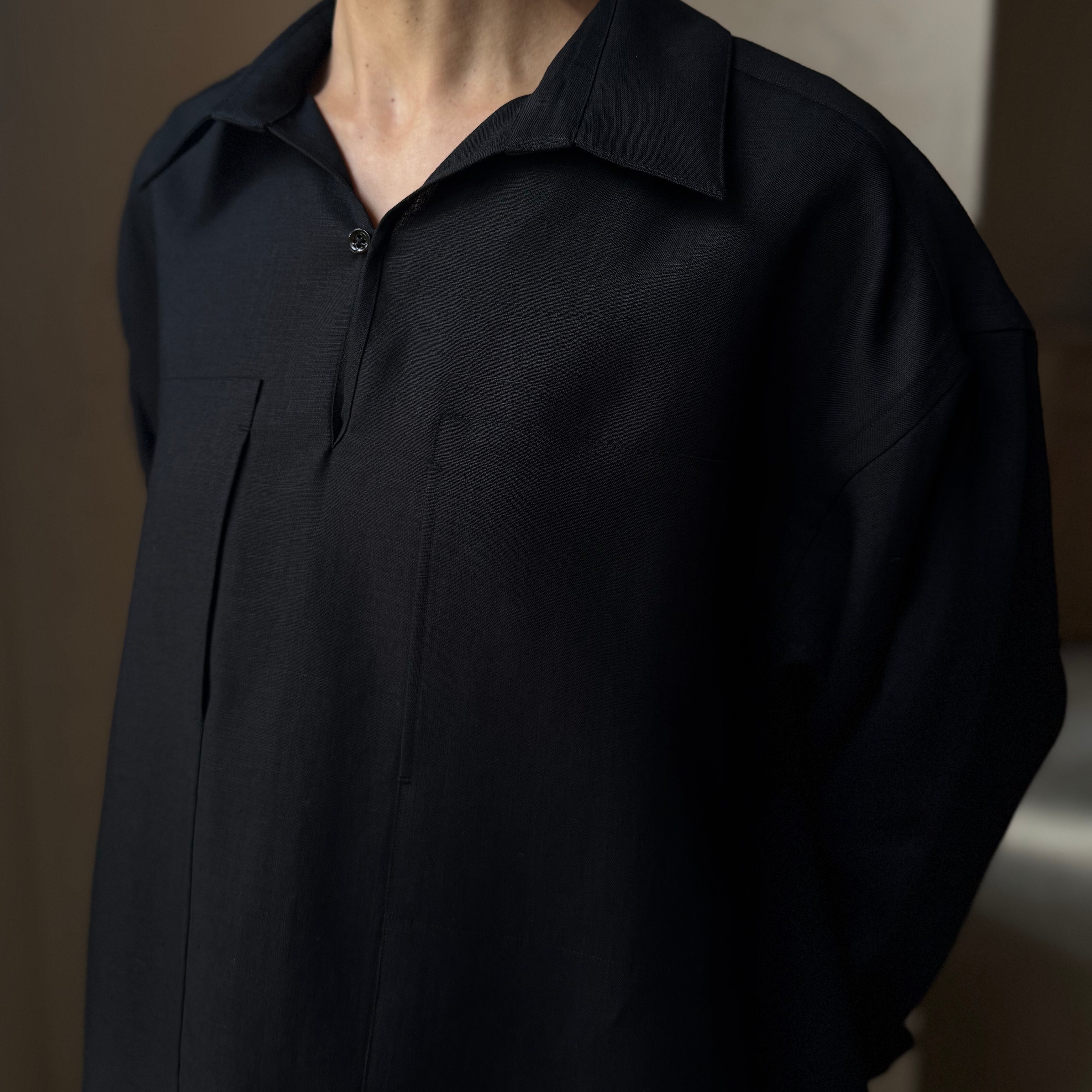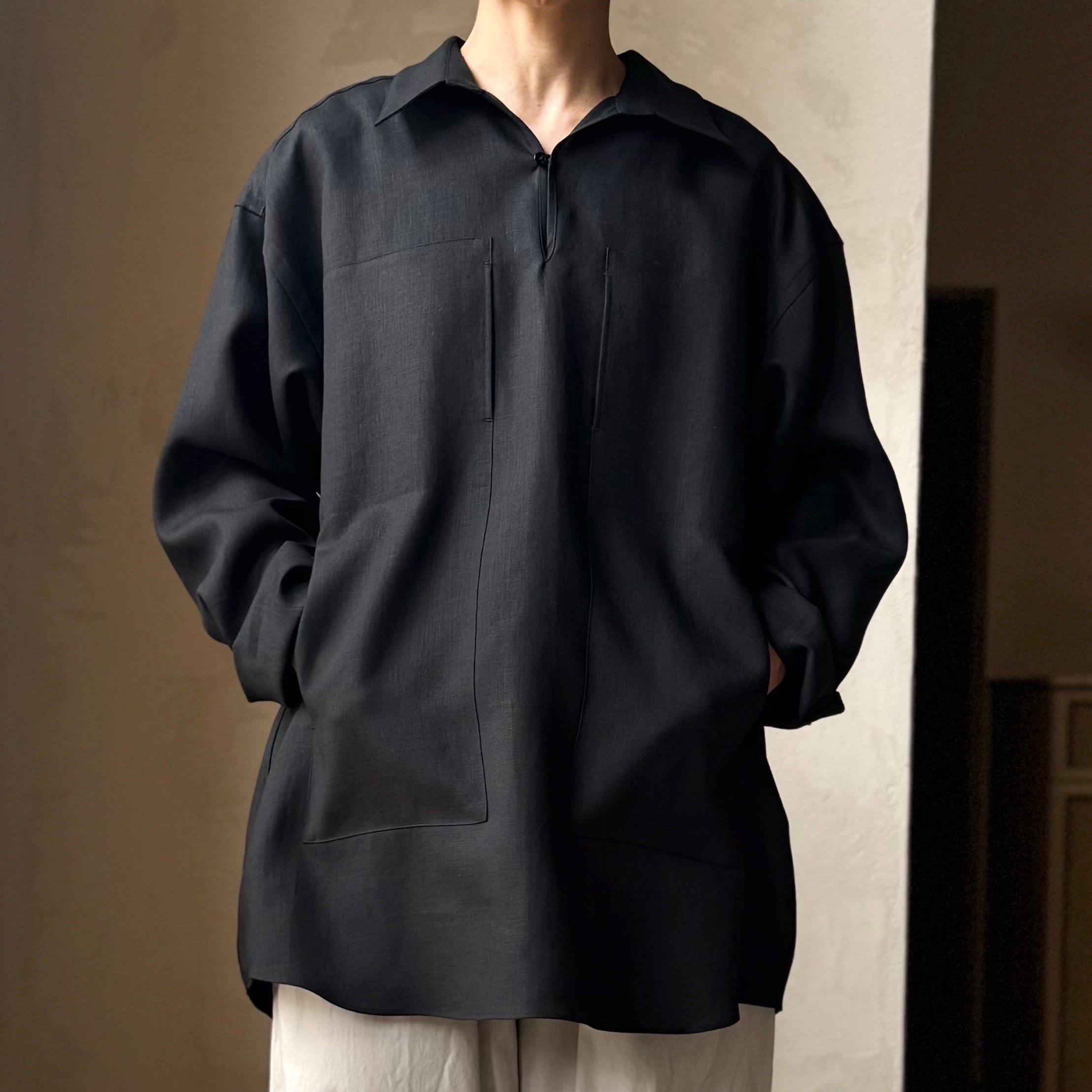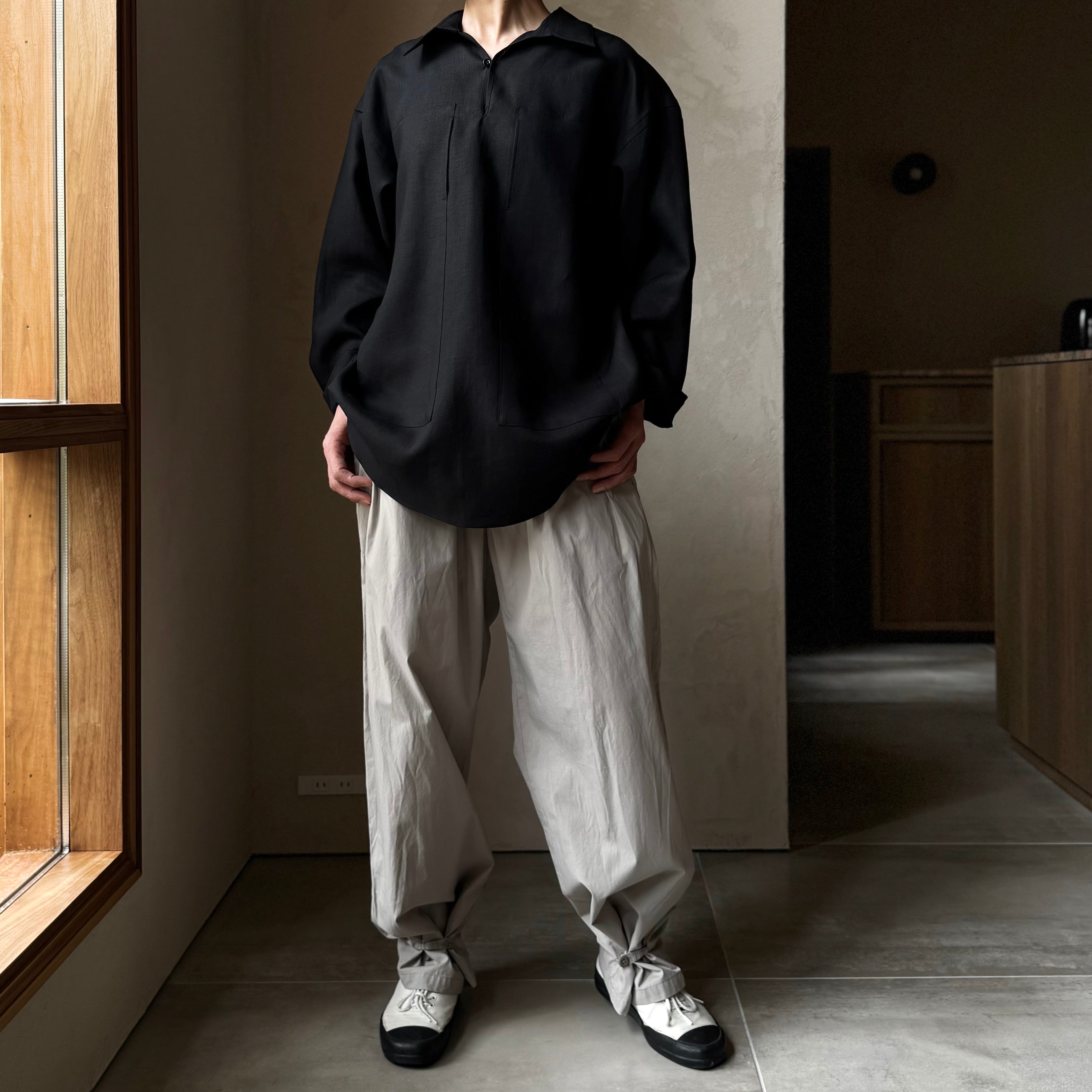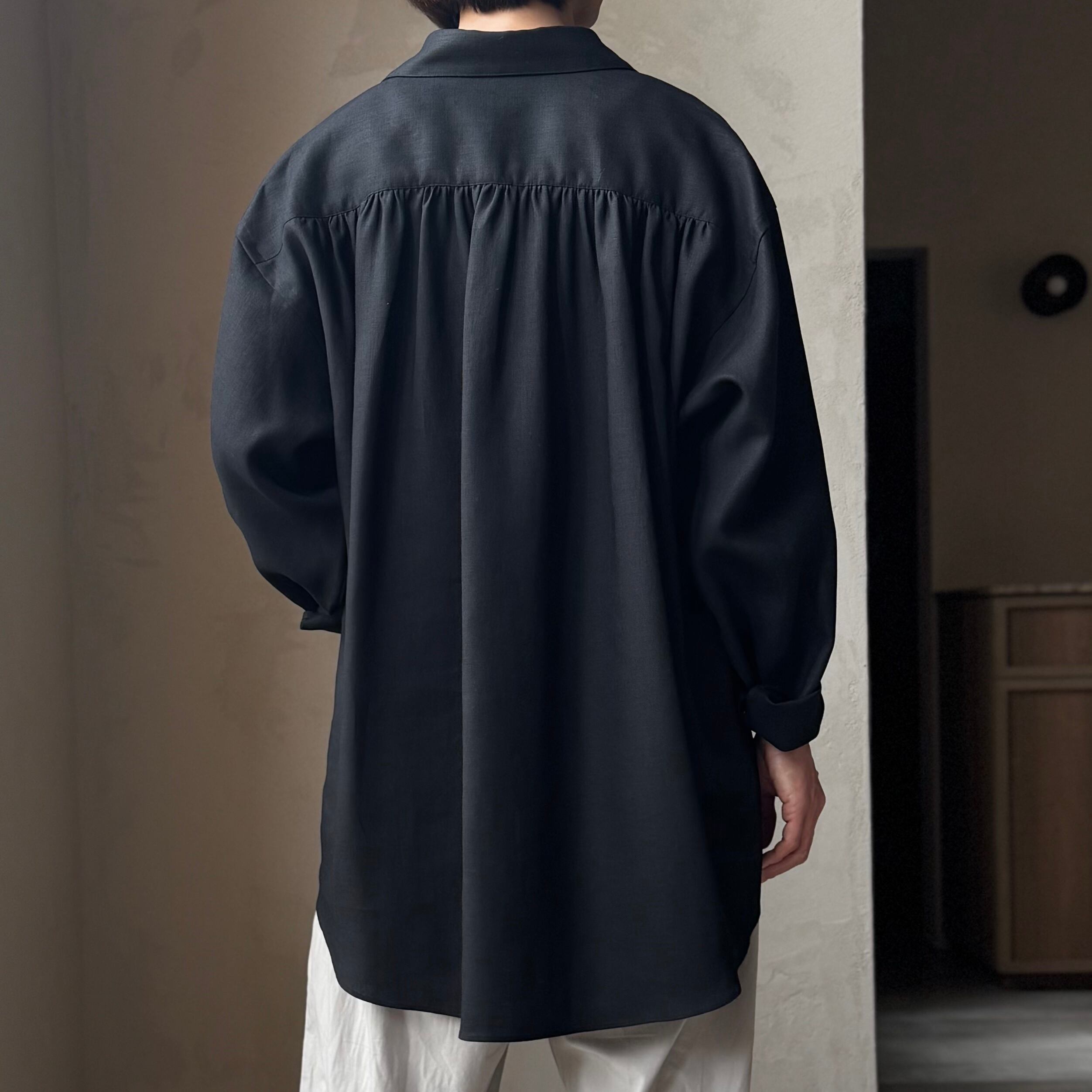 背中にギャザーのプルオーバーシャツ。前には大きなポケットを配しています。カフ無し。