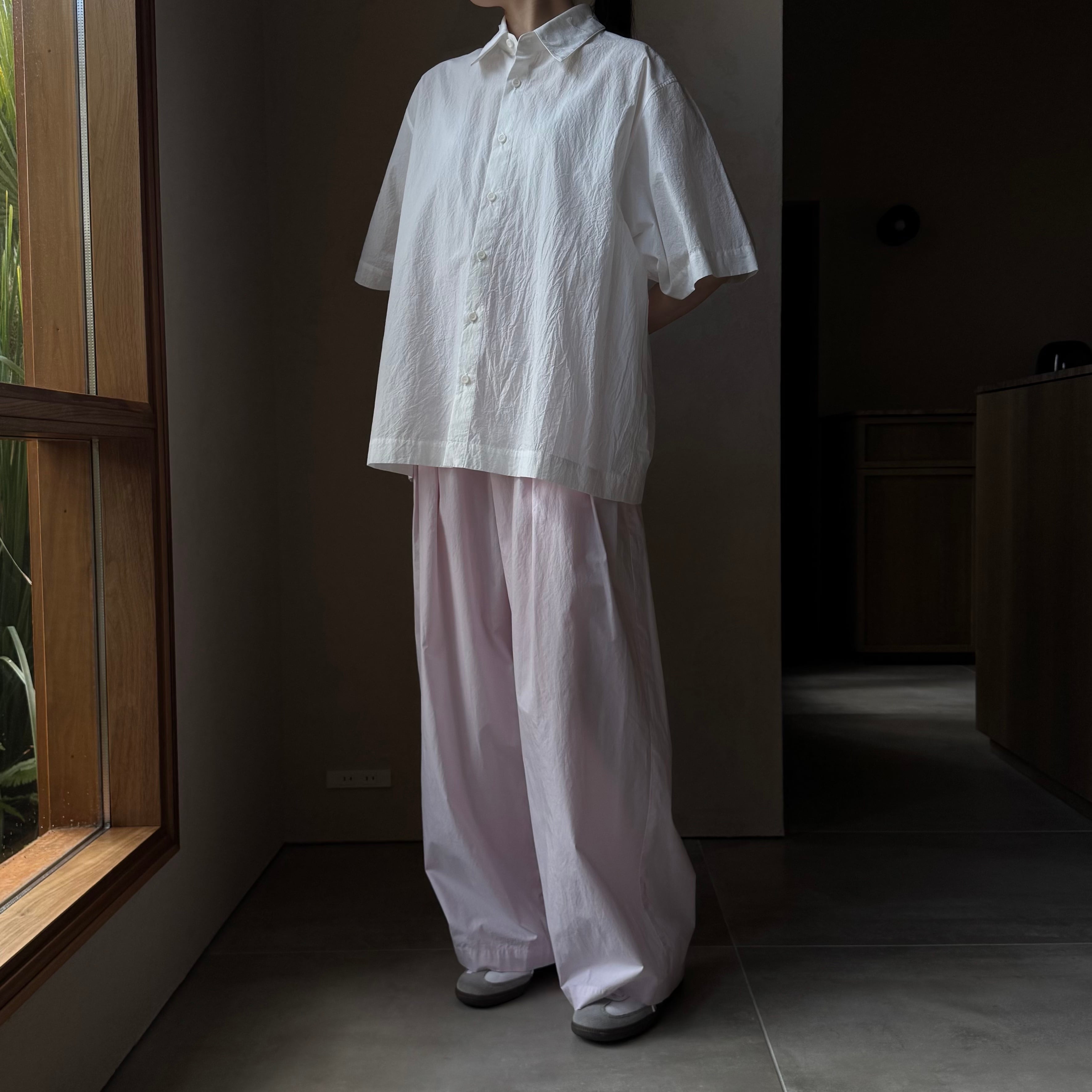 アメリカのスーピマコットンを使い、やや粗めに浜松市で織られた薄い平織り素材です。細番手の糸で、やや粗めに浜松市で織られた薄い平織り素材です。製品染めで綿本来の膨らみを最大限引き出した、滑らかでとても軽い、ATONオリジナルのローン素材です。