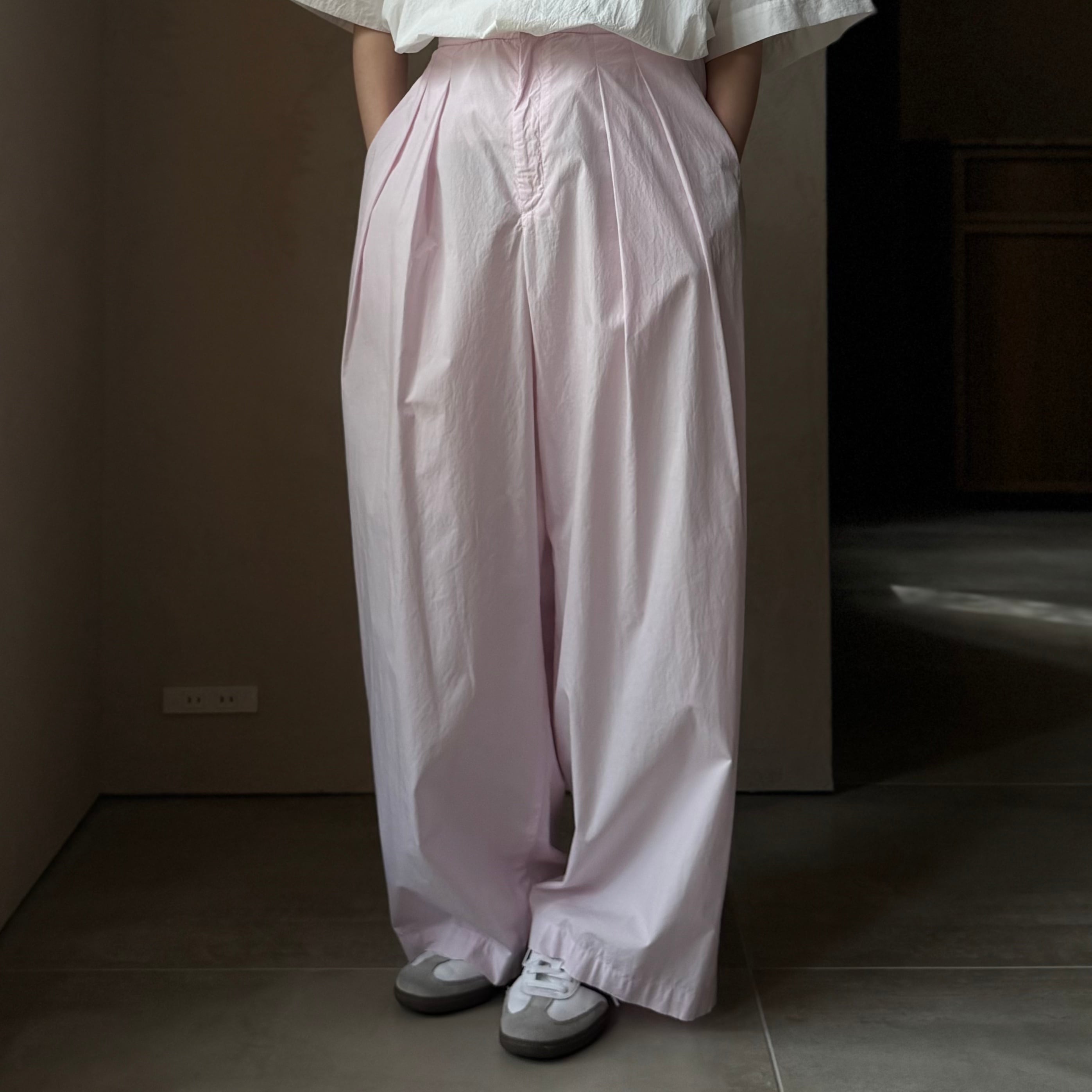 分量感のある内タックのワイドパンツ。裾に向かってうっすらテーパードのかかったラインで、シューズを選ばず着用いただけます。