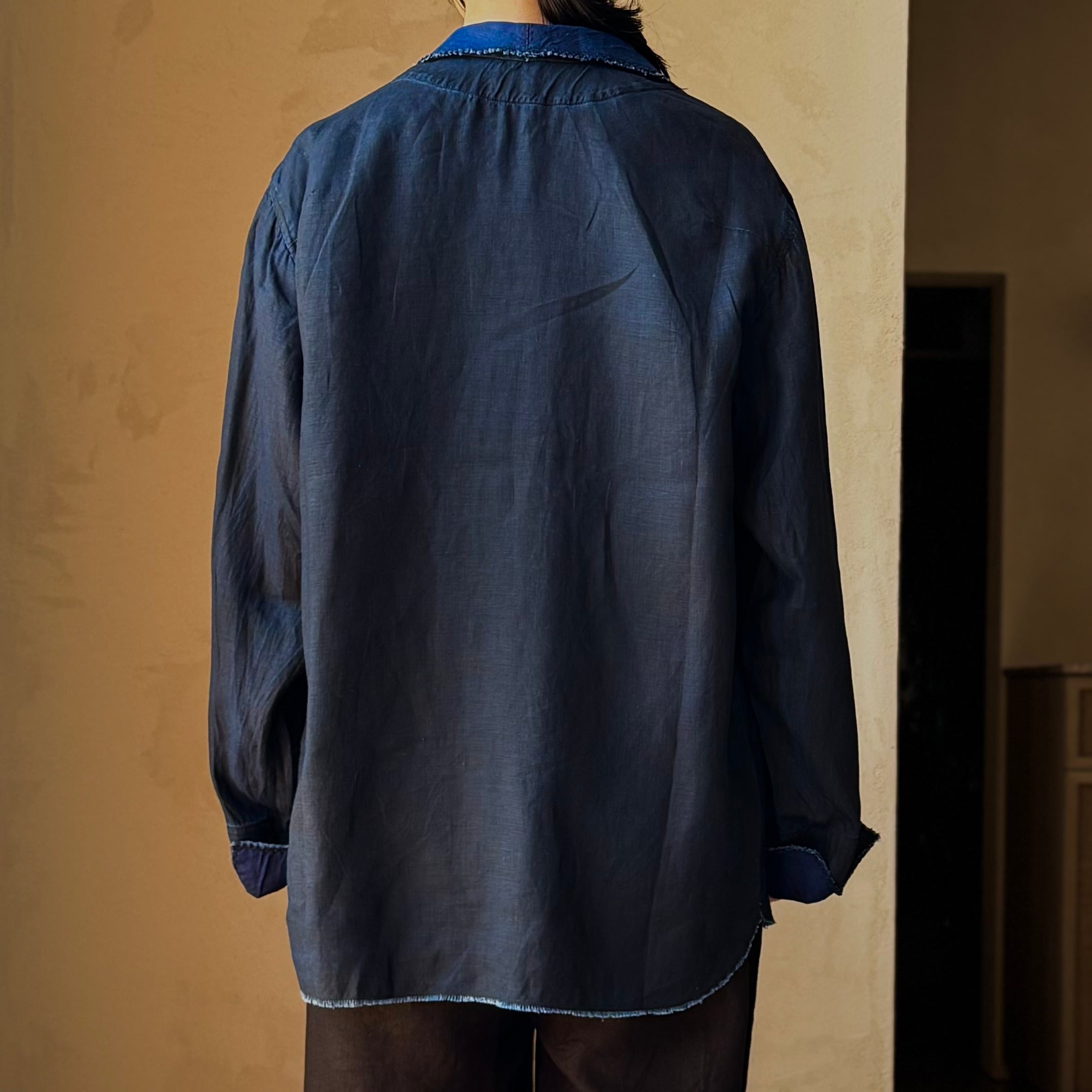 生地の複雑な染色構造を感じられるよう、前端や裾はあえて切りっぱなしの仕上げに。