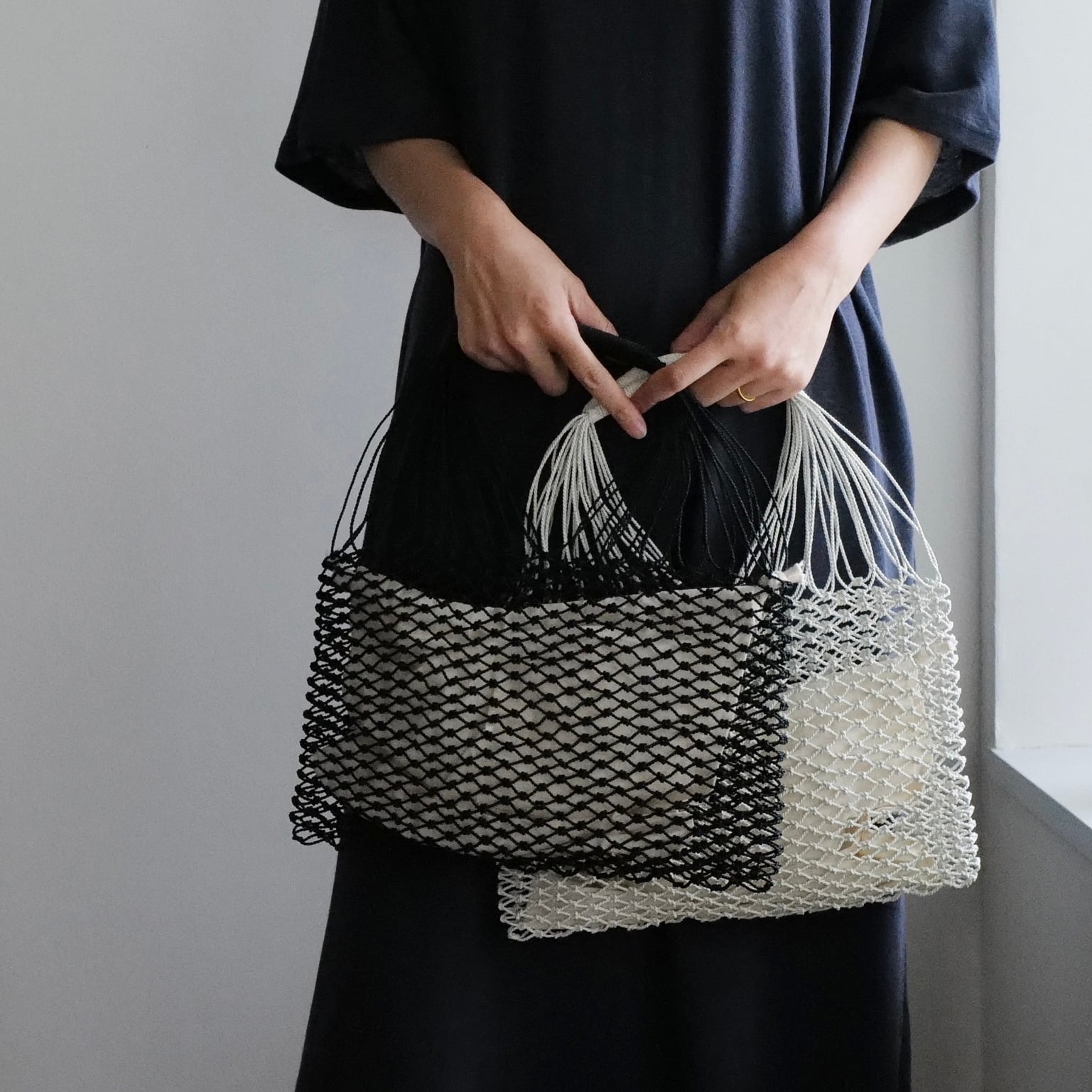 撚り合わせたレザーをツイスト状にしてメッシュに編み上げ形成されているので、