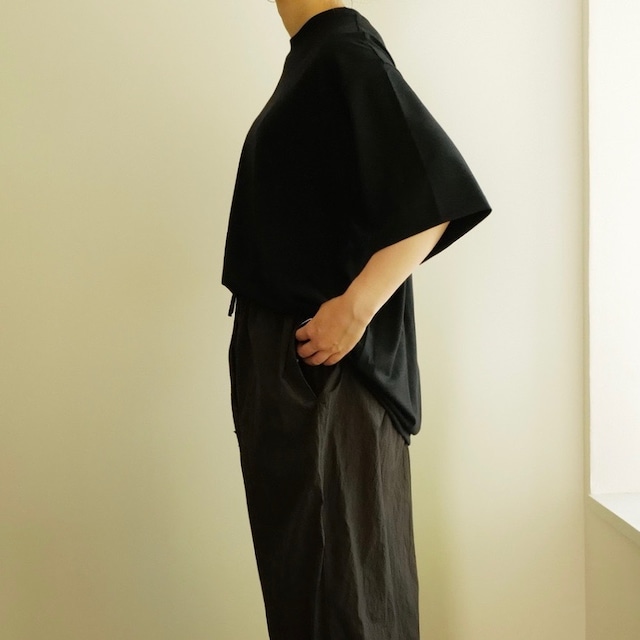 ヒップにボリュームをもたらした、パラシュートのような丸みのあるシルエットが特徴のカーゴパンツ。ウエストゴム仕様でベルト内側に紐が通っているため、表に紐を出さず調節して着用が可能です。シワになりづらいので持ち運びにも便利で、速乾性もありイージーケアです。